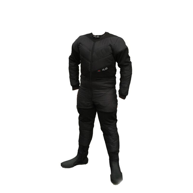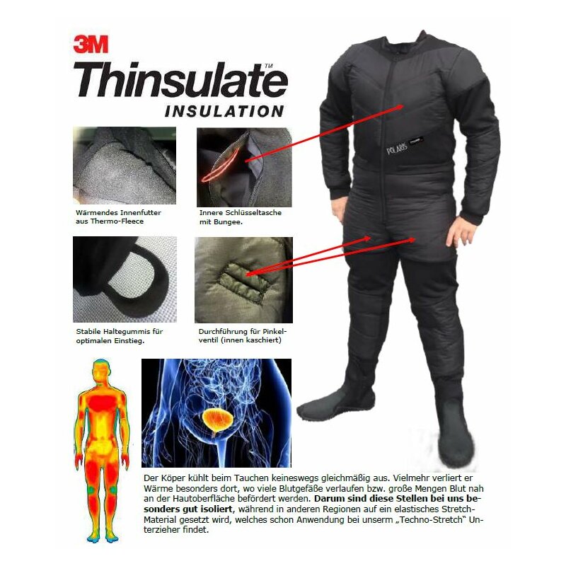 Entscheidend für das Wärmeempfinden bei extrem kalten Tauchgängen ist die richtige Isolierung. Oft werden daher große Mengen Isolationsmaterial verwendet, ohne sich Gedanken über die menschliche Physionomie oder den Auftrieb zu machen. Der POLARIS Ice Proof wärmt dort besonders gut, wo es am nötigsten ist und setzt an anderen Stellen auf flexible Isolationsstoffe um einen perfekten Sitz in Verbindung mit geringem Auftrieb zu gewährleisten. Eine zusätzliche Isolationsschicht im Hüftbereich schützt zudem die Blase vor Kälteeinwirkung. Für die Isolation nutzen wir die innovatives Thinsulate Ultra™ von 3M. Dieses isoliert bei halber Materialstärke mindestens so gut wie herkömmliche, dickere Thinsulates. mit wärmendem Innenfutter aus Thermo Fleece mit Inneren Schlüsseltasche mit Bungee Stabile Haltegummis am Fuß mit Durchführung für Pee Valve /Unisex